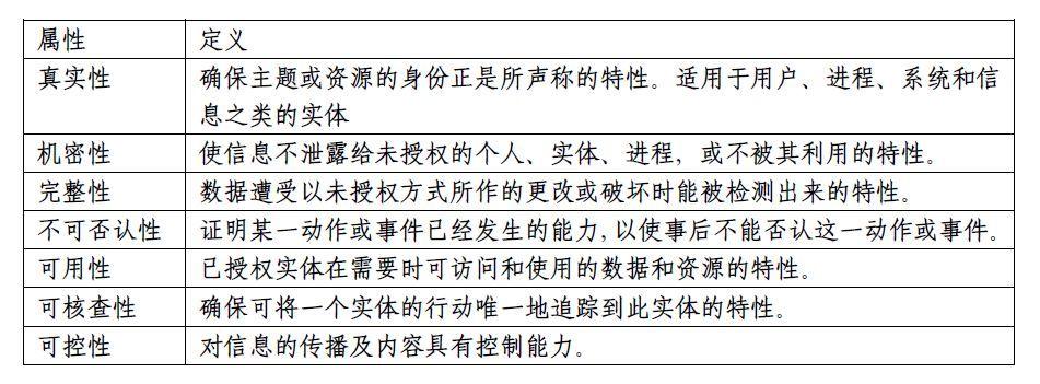 信息安全是指對信息系統(tǒng)的硬件、軟件、系統(tǒng)中的數(shù)據(jù)及依托其開展的業(yè)務(wù)進行保護,使得它們不會由于偶然的或者惡意的原因而遭到未經(jīng)授權(quán)的訪問、泄露、破壞、修改、審閱、檢查、記錄或銷毀,保證信息系統(tǒng)連續(xù)可靠地正常運行。信息安全具有真實性、機密性、完整性、不可否認性、可用性、可核查性和可控性七個主要屬性: